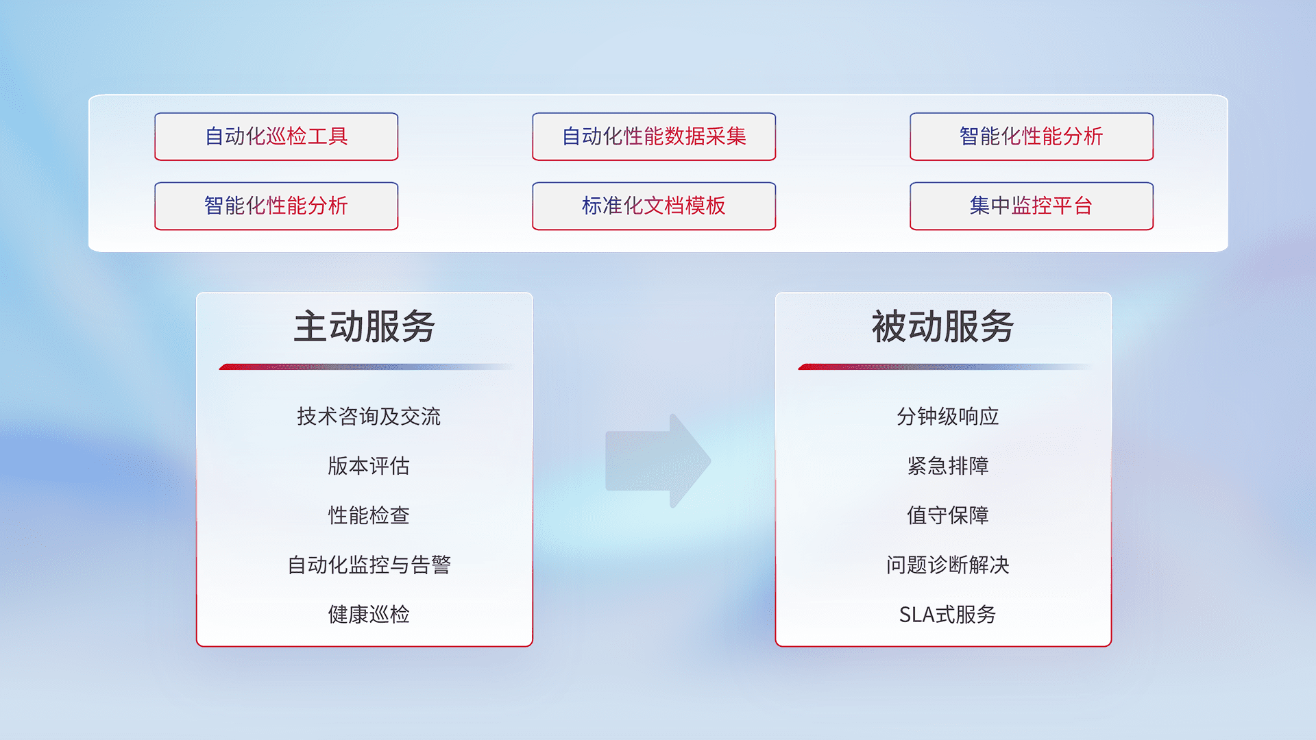智能化工具和标准化文档,,,保障服务质量,,,,提供主动服务(包含技术咨询、、版本评估、、、性能检查、、、自动化监控与告警、、、、健康巡检)和被动服务包含(分钟级响应、、、紧急排障、、、、值守保障、、、、问题诊断解决、、、SLA服务)。。